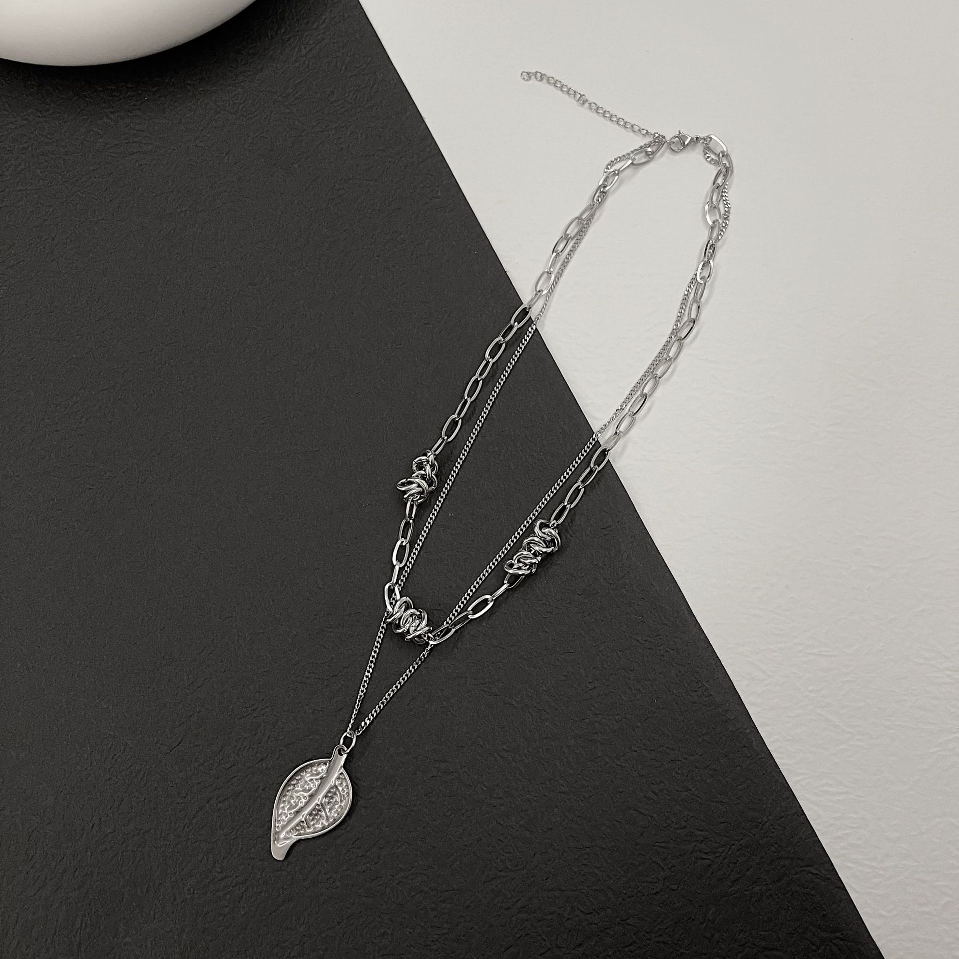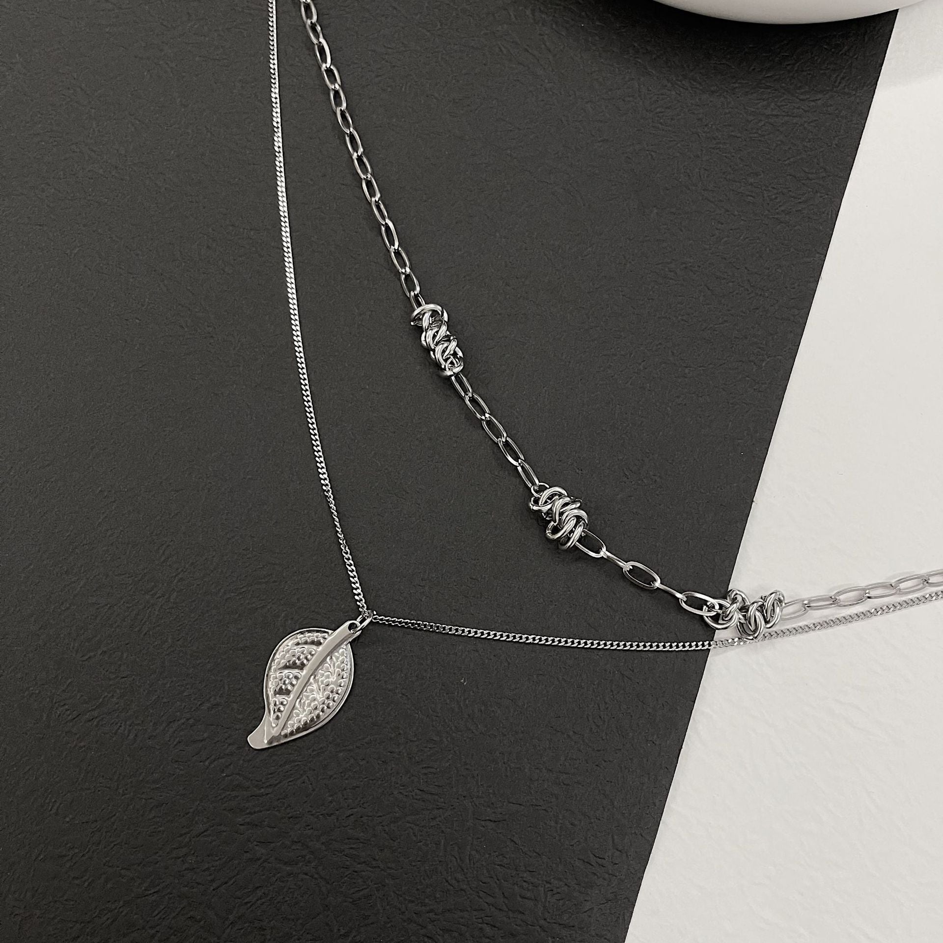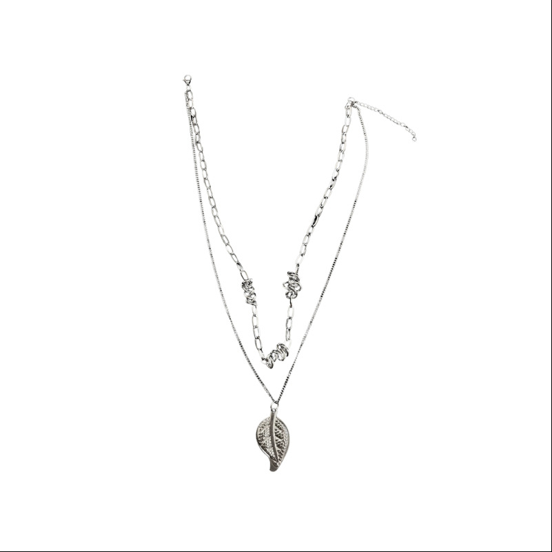 Double Layered Metal Leaf Pendant Knotted Chain Thorns Titanium Steel Necklace